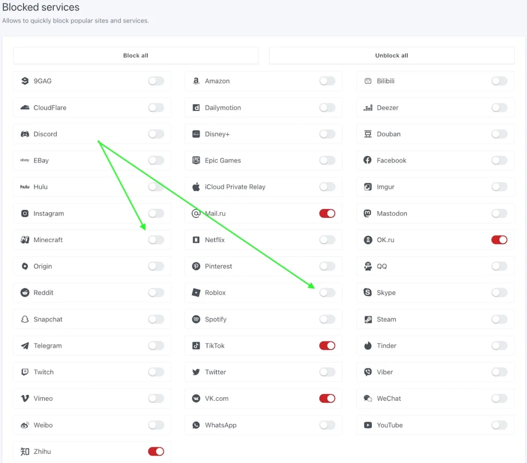 As a parent I want to limit entertainment and game time for my kid. Fortunately, AdGuard has presets to block a bunch of services like: