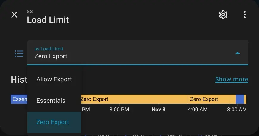 I created an automation that sets the LoadLimit to “Essentials” when solar production is sufficient, and reverts it back to “ZeroExport” when production stops to prevent unnecessary battery drain.