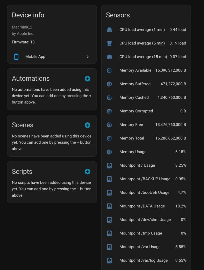 If everything is set up correctly, you should see multiple system-related sensors ready to use in your dashboards and automations: