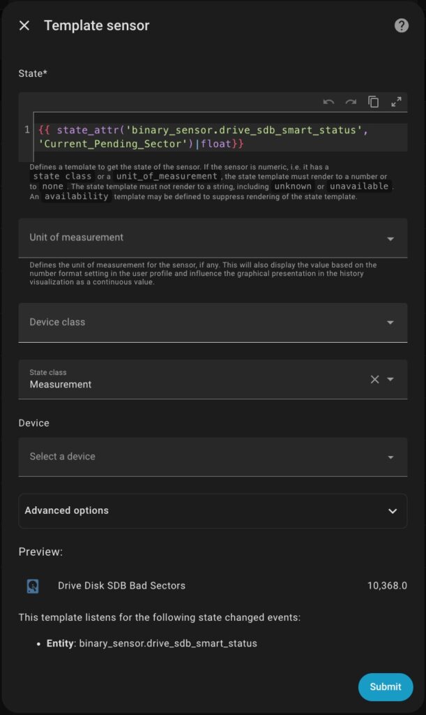 {{ state_attr('binary_sensor.drive_sdb_smart_status', 'Current_Pending_Sector') | int}} Unit of measurement: