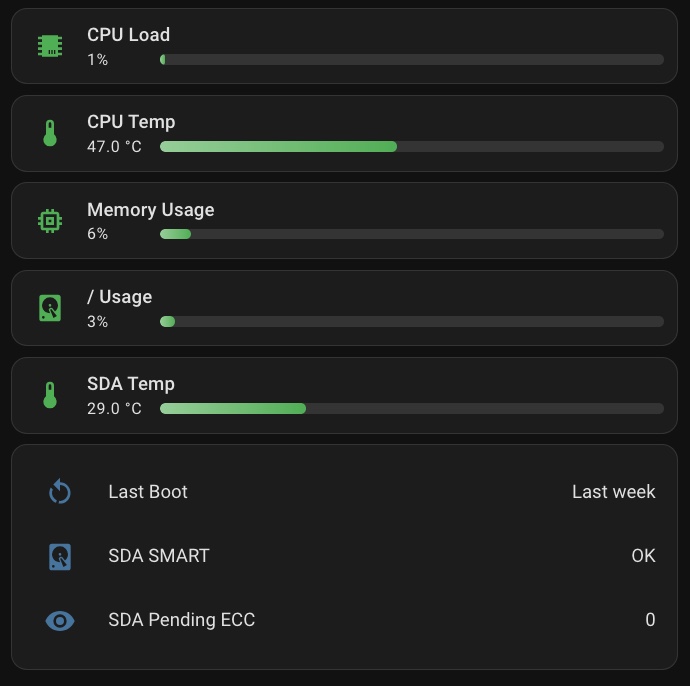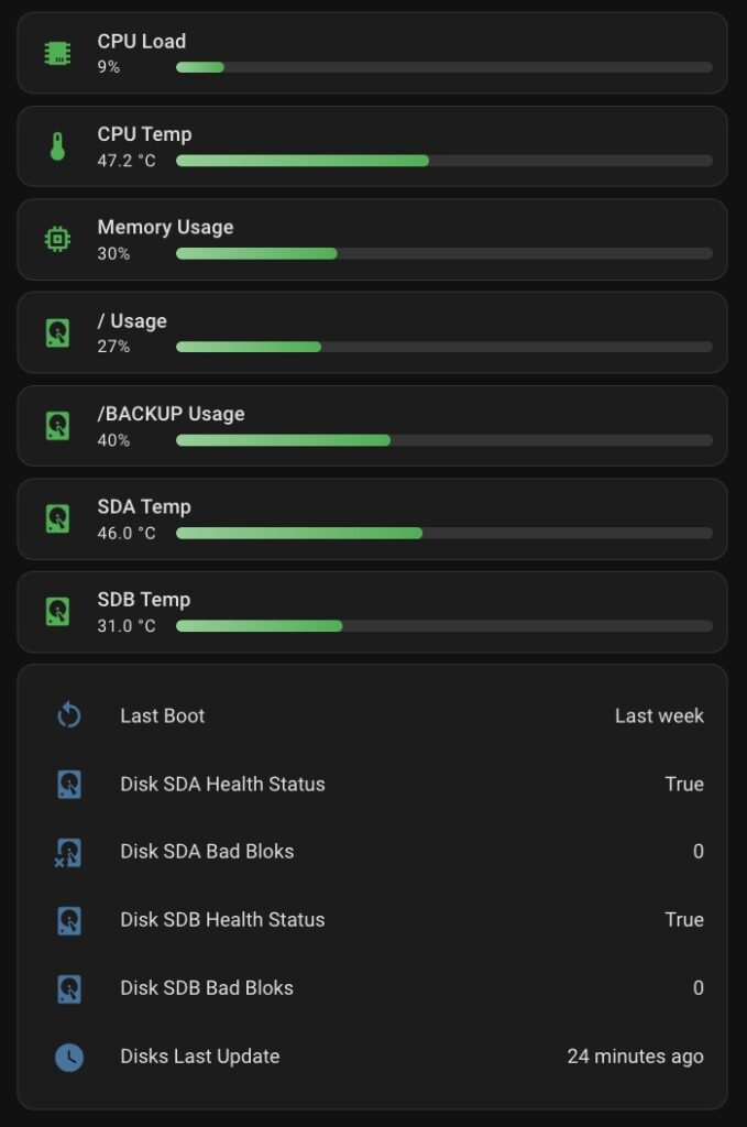 As a simple example, I created a card that displays sensors for one mount point and one disk. You can easily extend this approach by adding more sensors for additional disks, mount points, or SMART attributes as needed.