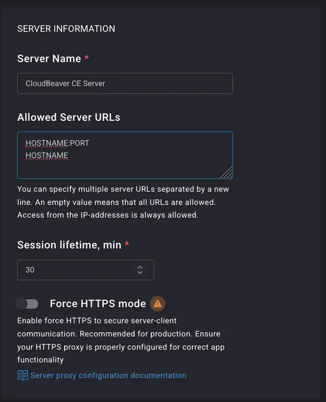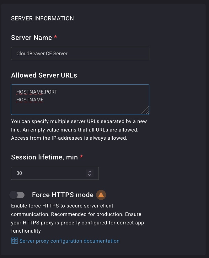 In the next step, don’t forget to add your internal and external HA hostnames without and with their ports to the “Allowed Server URLs” section. Otherwise, access to your CloudBeaver can be blocked by its security rules.