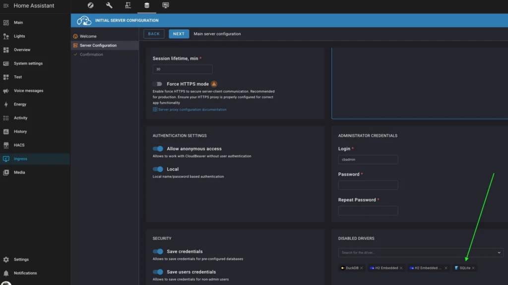 Now, finalize your setup and create a connection to your SQLite HA database using the right-side path from your CloudBeaver docker compose config: