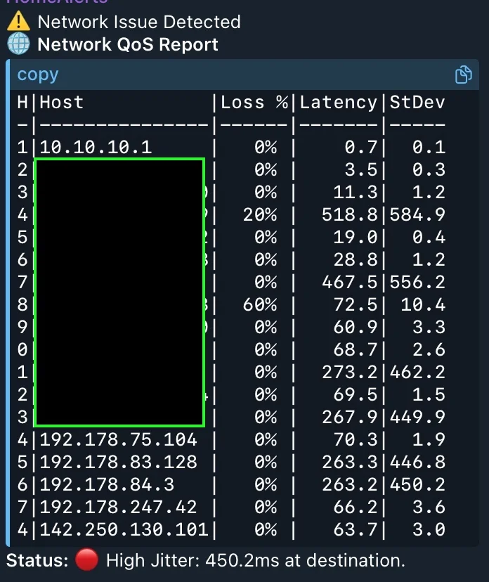 CHECK_WINDOW: Set to3. This tells the script to only evaluate the last three visible hops before the destination. This is your “Last Mile” strategy—ignoring local fluctuations to focus on the service’s entry point.LOSS_THRESHOLD: Currently set twice (see note below). This is the percentage of packet loss that triggers a “Network Crisis” state.
