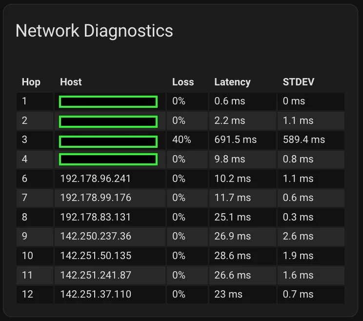 # This regex captures Hop, Host, Loss, Sent, Avg, and StDev
